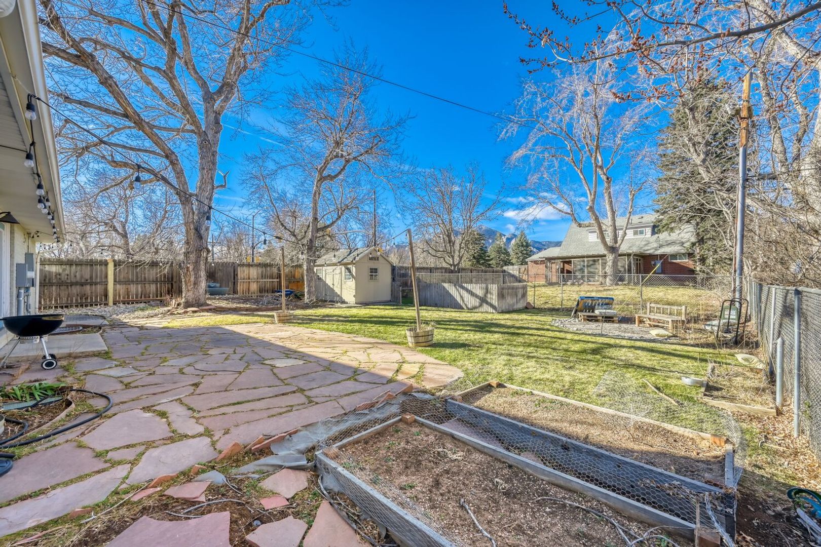 Enjoy a flagstone patio and water feature, two raised garden beds with fresh topsoil, a raised flower bed, and a newly built shed with power—perfect as a workshop. Adjacent fenced dog run features artificial turf for easy maintenance.