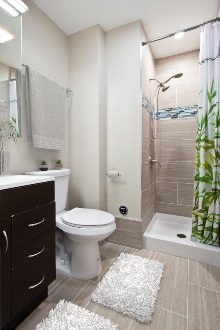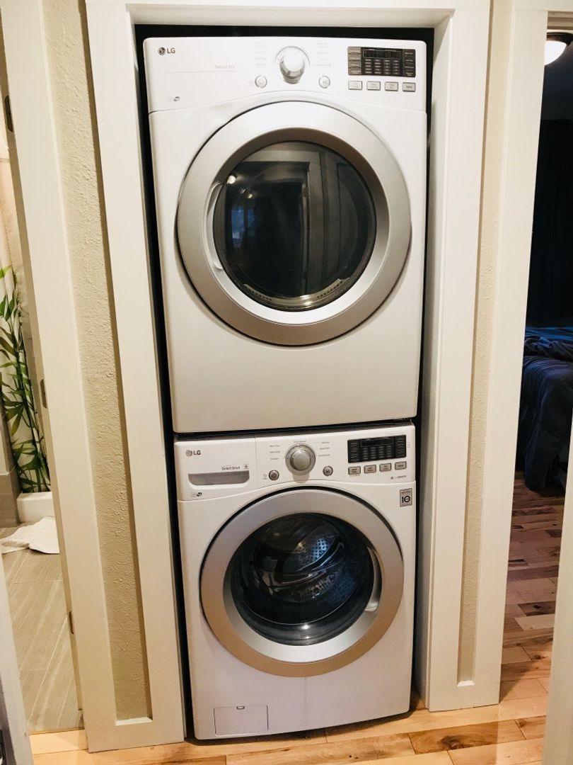 A quiet front-load washer and dryer are conveniently located near the bedrooms for added ease.