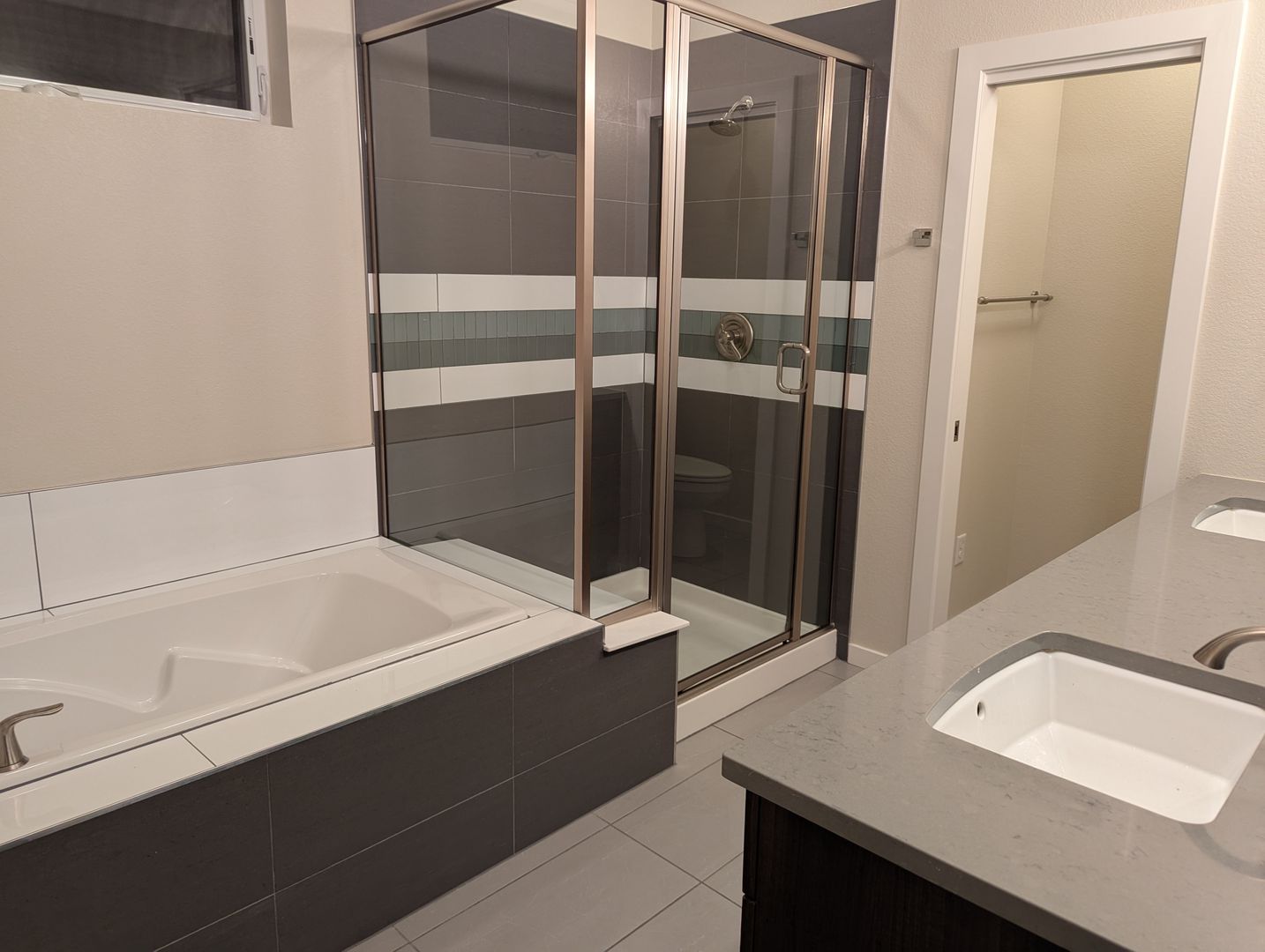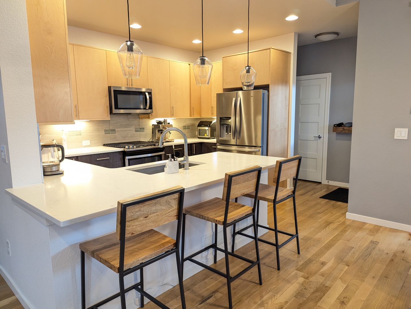 The gourmet kitchen is a chef’s dream, complete with modern cabinetry, quartz countertops, stainless steel Whirlpool appliances, Kohler under-mount sinks, and a large eat-at peninsula. Relax by the cozy fireplace in the great room or step outside to the private courtyard with a gated entry and covered back patio.