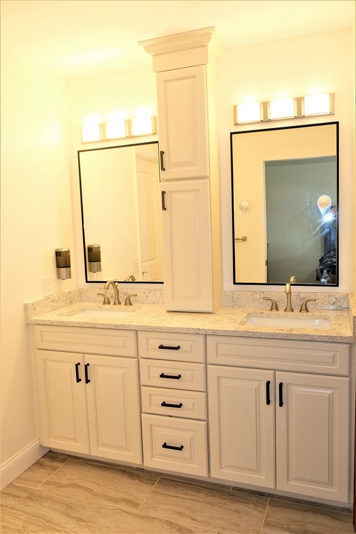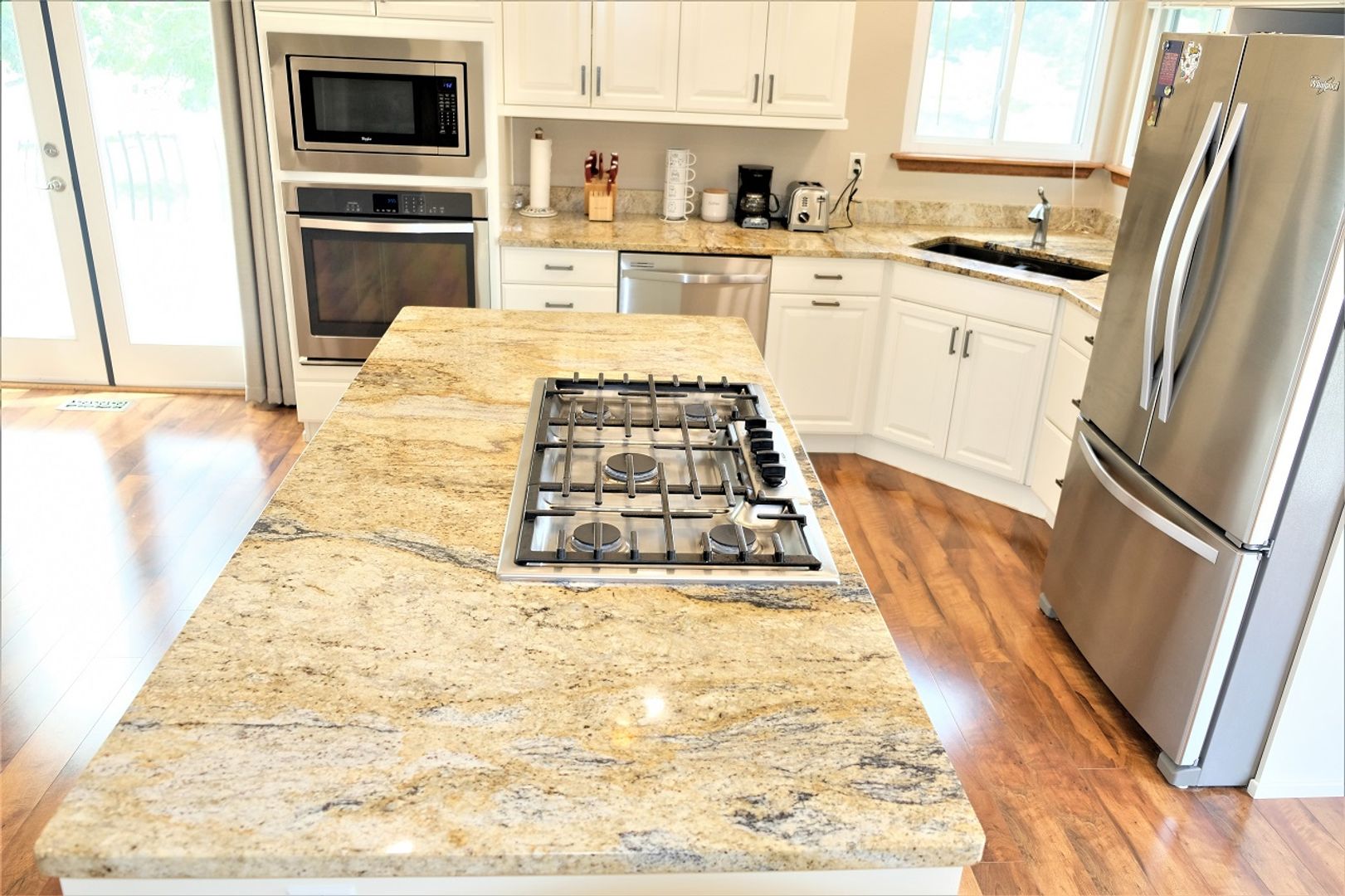 The upgraded kitchen includes granite countertops, stainless steel appliances, a large island, and an oversized refrigerator. The main level features a spacious primary suite with walk-in closet, plus two additional bedrooms and two bathrooms.