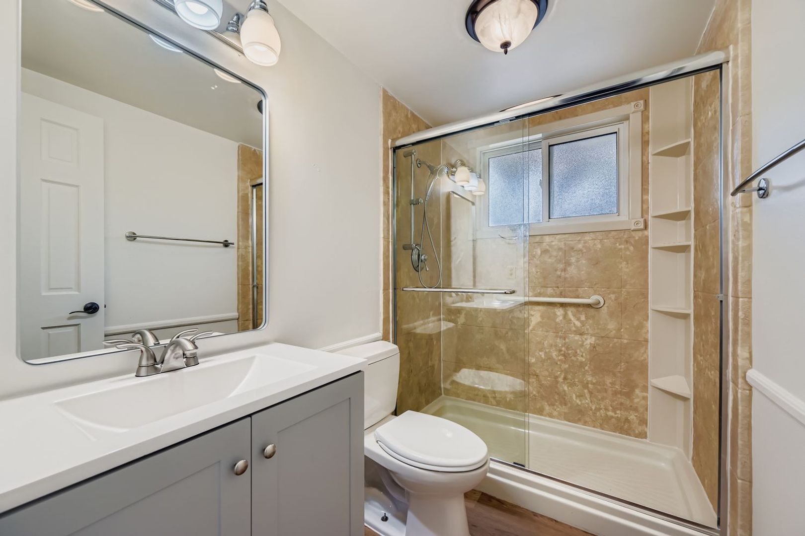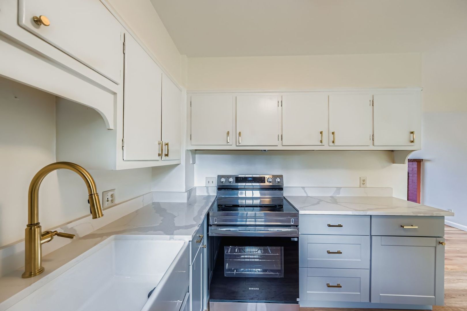 Step inside to a brand-new designer kitchen featuring quartz countertops, brass hardware, a farmhouse sink, all-new stainless appliances, and curated West Elm lighting that truly elevates the space. The open living room is warm and inviting with hardwood floors, a classic wood-burning fireplace, and expansive windows that pour in natural light. Fresh interior paint in Sherwin Williams “Alabaster” creates a bright, elevated, move-in-ready feel throughout.